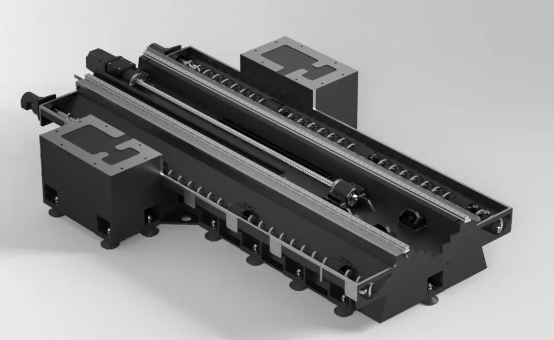 床身導軌(X 軸)、橫梁導軌(Y 軸)和滑枕導軌(Z 軸)均采用進口重載滾柱直線導軌,摩擦力小、承載能力強、高速振動小、低速無爬行、定位精度高。橫梁導軌采用階梯式布置,加大導軌跨距,提高承載能力,有良好的承載性能,保證加工時切削平穩。